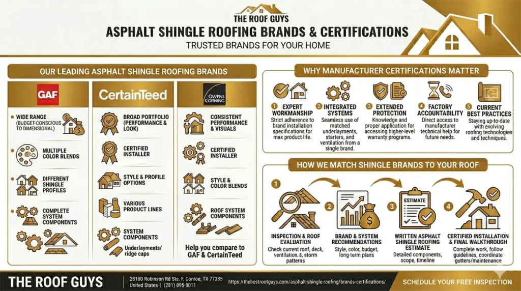 The Roof Guys is certified through CertainTeed and Owens Corning for asphalt shingle roofing. That means our team has completed manufacturer training and meets program requirements specific to those brands.
