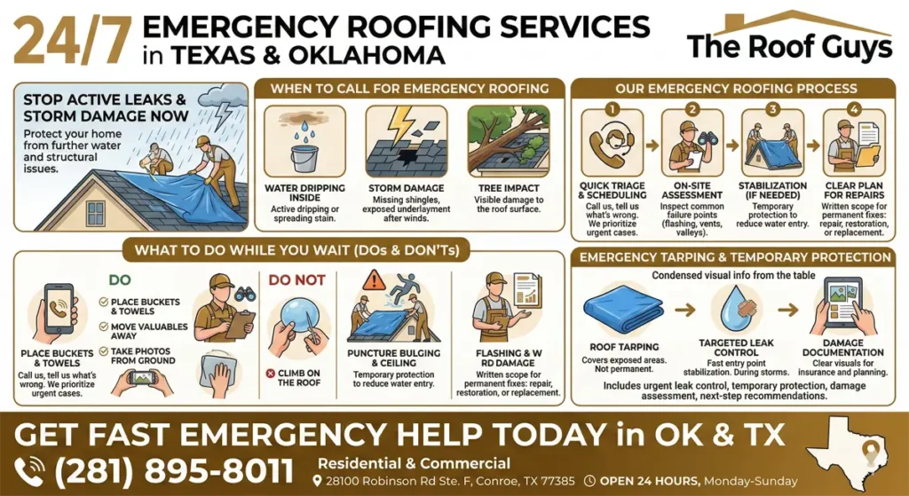 Roof Emergency Type | Common Cause in Texas & Oklahoma | Visible Signs | Immediate Solution |