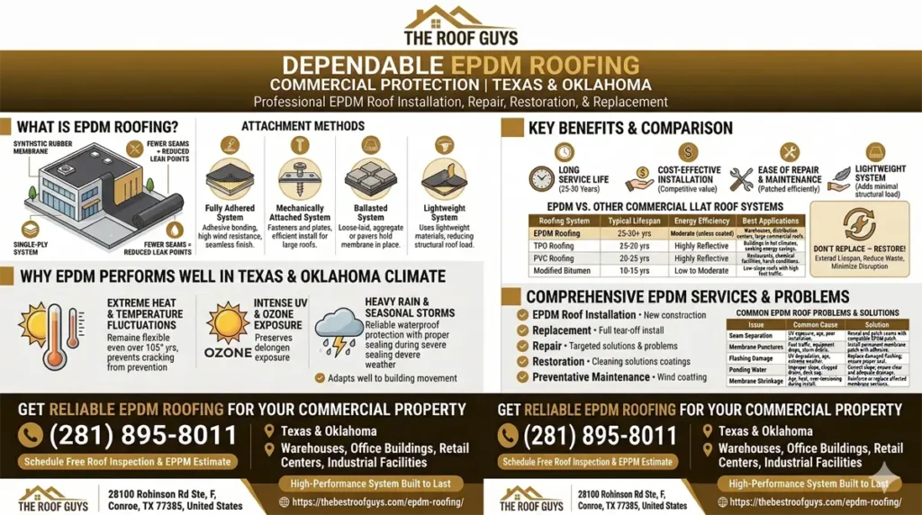 If you’re looking for long-lasting, cost-effective EPDM roofing in Texas or Oklahoma, The Roof Guys provide professional EPDM roof installation, repair, restoration, and replacement for commercial buildings. EPDM (Ethylene Propylene Diene Monomer) is a durable synthetic rubber roofing membrane engineered specifically for low-slope and flat commercial roofing systems.
