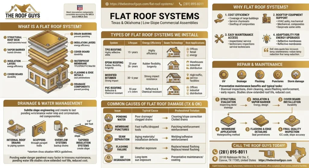 Flat and low-slope roof systems are widely used across Houston, Conroe, The Woodlands, Oklahoma City, and other commercial hubs because they offer practical advantages for large commercial structures.