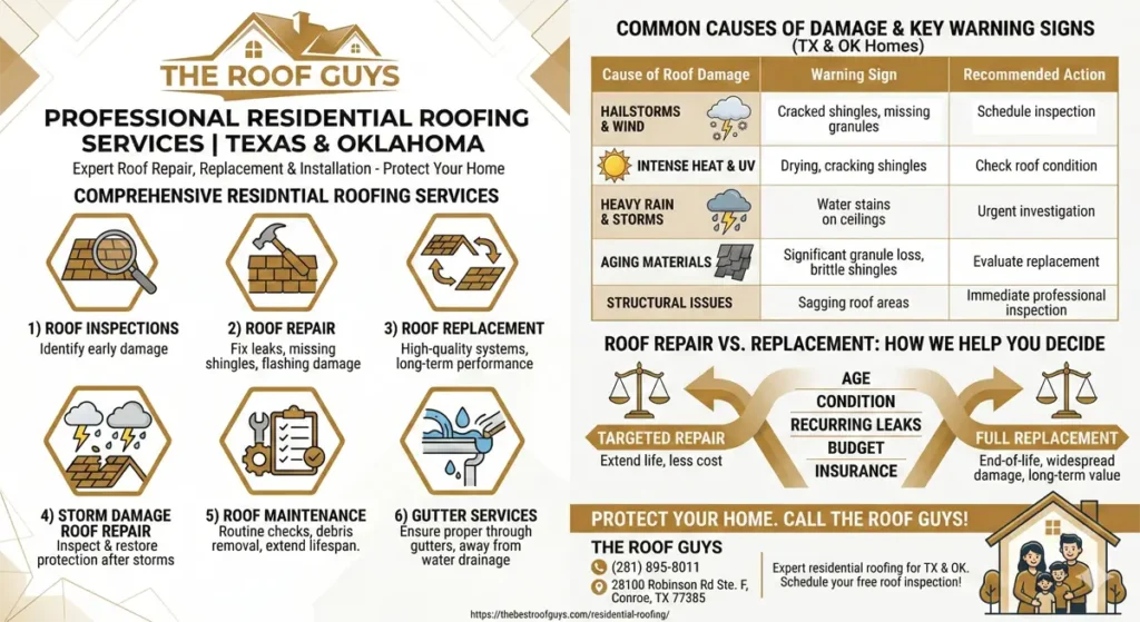 Your roof is your home’s first line of defense against Texas heat, Oklahoma storms, and everything in between. The Roof Guys provide professional residential roofing services designed to keep your home dry, comfortable, and protected year-round. Whether you need a small repair or a full roof replacement, our team delivers code-compliant, high-quality work backed by attentive customer service.