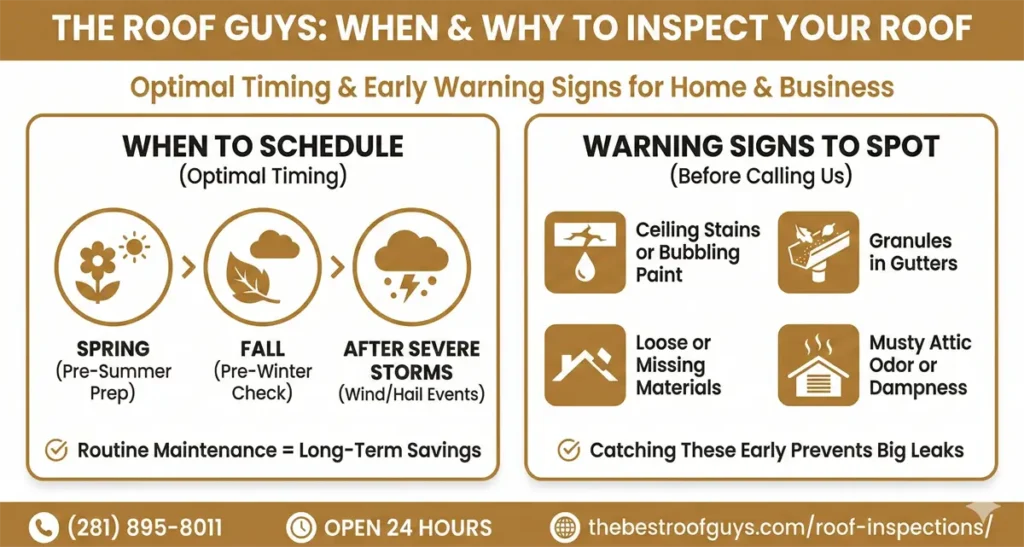 Ready for clear answers about your roof? Call The Roof Guys at (281) 895-8011 or book online with a free inspection request. We’re open 24 hours and here when you need us.
