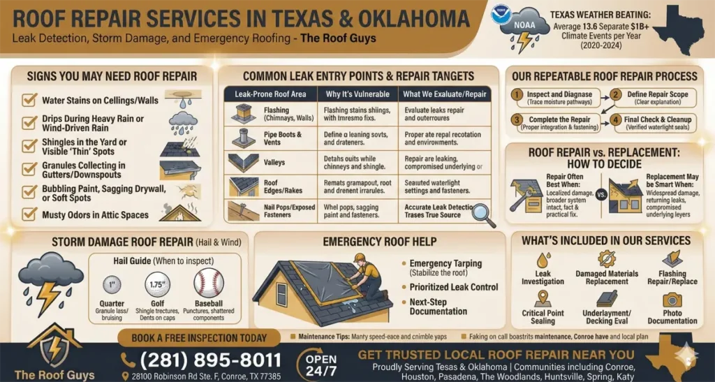 Don’t let a small roof leak turn into costly structural damage. Whether you’re dealing with storm damage, missing shingles, or active water intrusion, The Roof Guys is ready to respond with expert roof repair services across Texas and Oklahoma. Our team provides detailed inspections, clear repair plans, and dependable workmanship designed to restore your roof’s protection quickly.